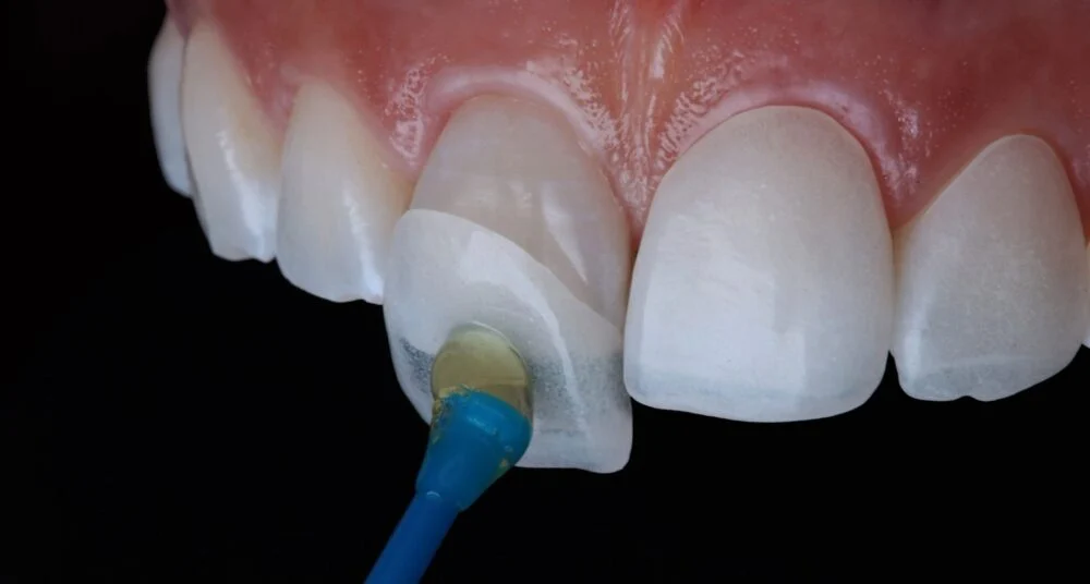 Dopo la pulizia, si effettua una mordenzatura con acido ortofosforico, che rende la superficie dentale ruvida per favorire l’adesione.